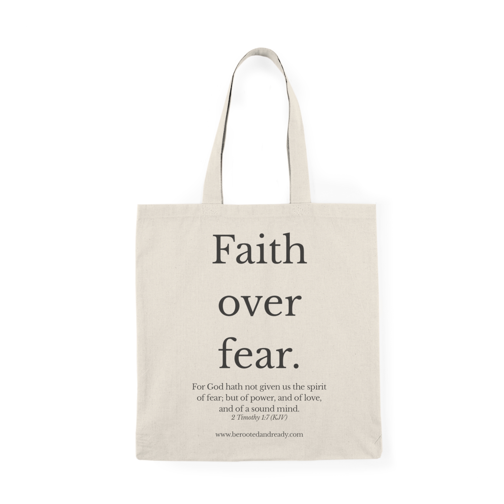 This “Faith Over Fear.” tote features the full verse from 2 Timothy 1:7 (KJV) —